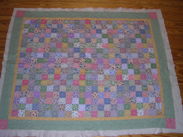 A baby quilt done in 30s Repro fabrics; the centers are bar-tacked with hearts and the border is hand-quilted.